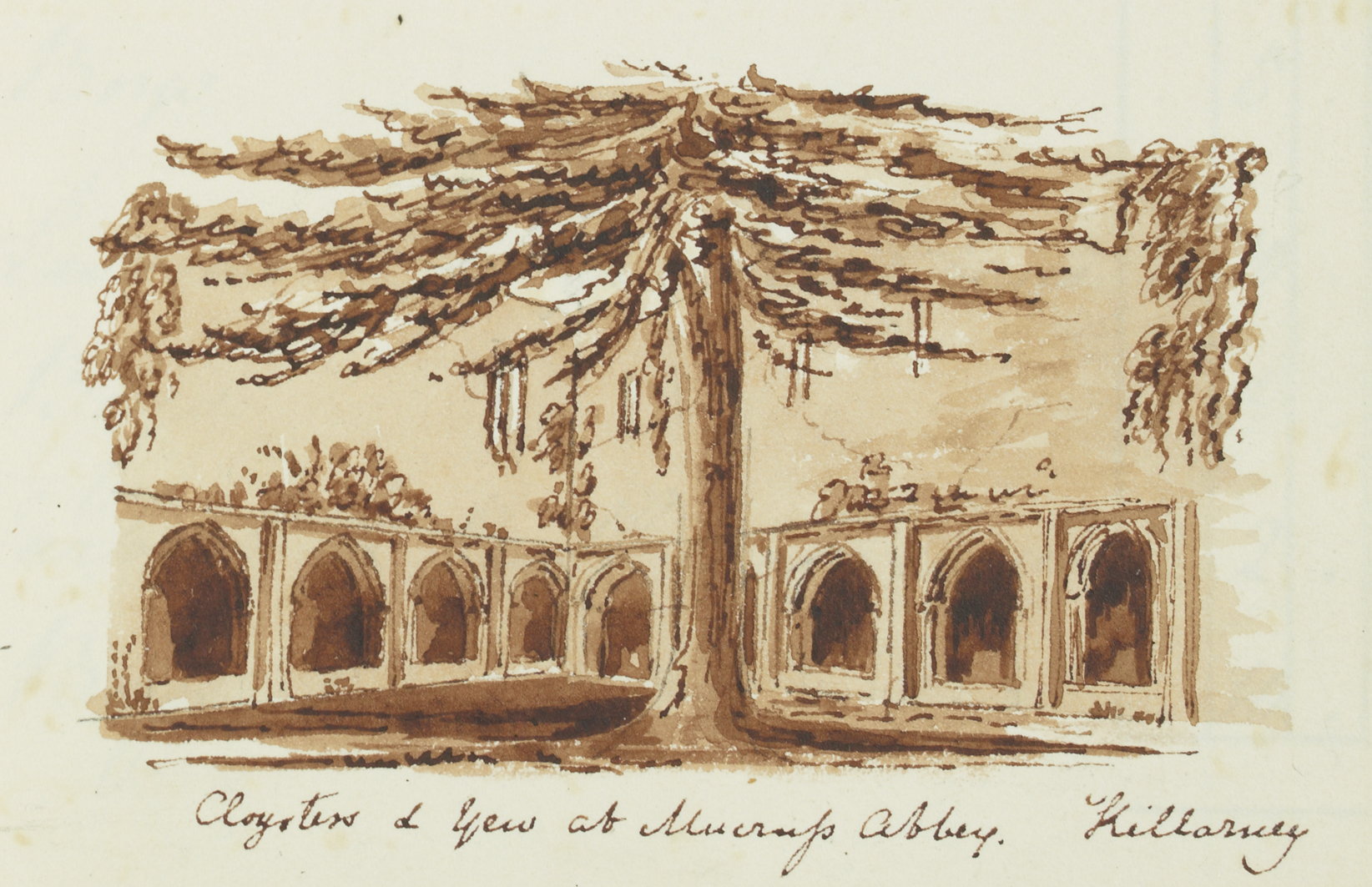 Interior of the cloisters of Muckross Abbey. A vast yew tree at the centre of the cloister dominates the image.
