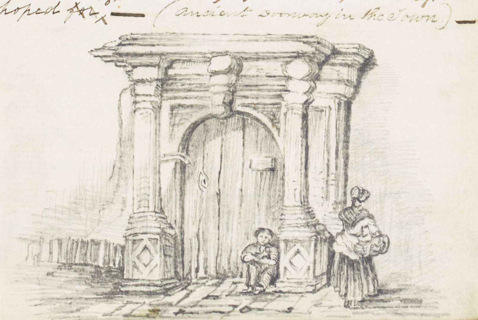 Pencil drawing of an ‘ancient doorway' in Galway city. A boy is sitting in front of the closed door, and a woman is standing on the right-hand side of the doorway.