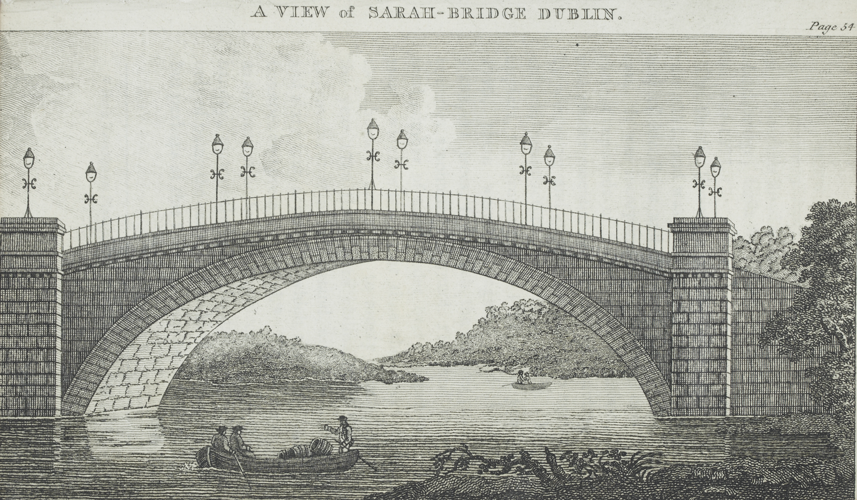 | In the year 1791 the right honourable John Beresford laid the foundation stone of Carlisle-bridge, which is a handsome structure of three arches; the architect Mr. Gandon; it was opened in July 1795; it is ten feet wider than Westminster-bridge, and forms an excellent communication between the eastern parts of Dublin, particularly Mountjoy and Merrion squares. On the 22d of June in the same year, Sarah, countess of Westmorland, laid the foundation of Sarah-bridge, near the Phoenix-park, which is allowed to be a model of the most beautiful architecture. It is three hundred and fifty-six feet long, and thirty-eight broad; the arch is an elliptic, one hundred and four feet in diameter, which is twelve feet superior to the famous Rialto at Venice. The keystone is twenty-two feet above high water mark; Sarah-bridge [footnote: “It was built by Mr. Alexander Stephens, a native of Scotland”] is a considerable ornament to the western part of the city. Near this stood an ancient bridge, called Island-bridge, built by queen Elizabeth in the year 1577. [pp. 54-55] |