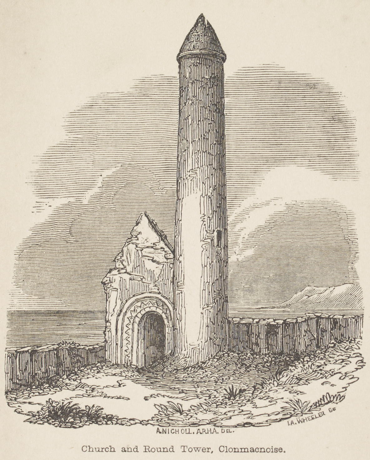 From thence we proceeded, the old man following us to the church and round tower which stands in the north-western extremity of the cemetery, and which is usually called McCarthy's church and tower. The round tower, though small, is one of the most perfect [p. 86] in Ireland: it is conically capped, and the ranges of stone, forming the cover, are of the most beautiful and singular arrangement. The tower stands on the south side of the chancel of the church; and the doorway of the tower, instead of being elevated ten or fifteen feet from the ground, is on a level with the floor of the chancel from which it leads ; it is within a few feet of the altar; moreover, the archway leading from the nave of the church into the chancel, which is of the most finished and at the same time chaste order of Gothic construction, is wrought into the body of the round tower part of whose rotundity is sacrificed to give room and form to the display of its light and elegant span; now these two circumstances convince me that, in the first place, the church and tower were built at the same time; moreover, that as the church was placed more remote than other churches, and nearer invaders coming across the Shannon, the tower was provided as a look-out station and place of ready retreat for the priests to retire to with their sacred vessels and books.