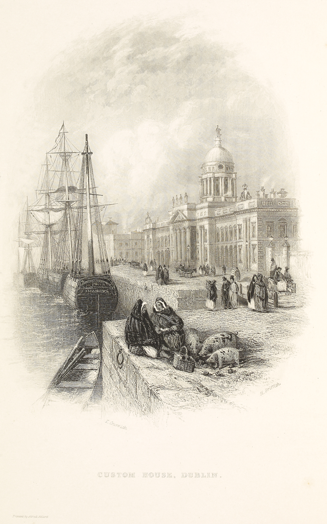 View of Dublin Custom House, from the quayside nearby. Two women enveloped in cloaks and hoods are sitting in the foreground, with baskets at their feet and three pigs apparently feeding on cabbages. A lively but relatively humble street scene, with numerous pedestrians and several vehicles, occupies the space in front of the focal building. Three ships, one with ‘Shamrock’ written across its stern, and a boat are docked by the quay.