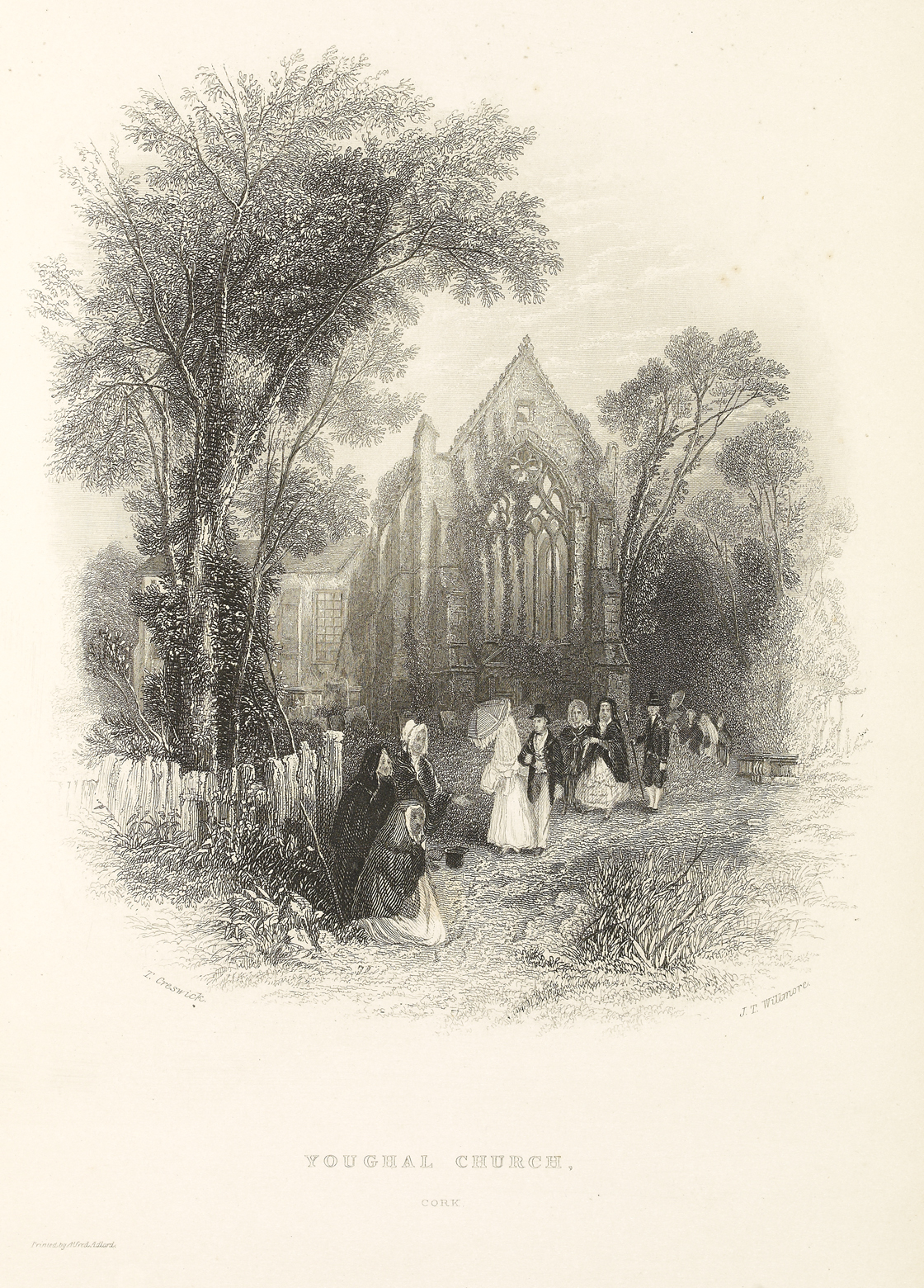 View of the chancel of St Mary’s Collegiate Church, Youghal, in Co. Cork, overgrown with vegetation. Grave-slabs are seen to the left. In front of these a woman on her knees, accompanied by two others, is begging for alms. Three other women and two men, richly dressed, are walking away from the building towards this group. More people are emerging from behind the side of the church, further back and to the right.