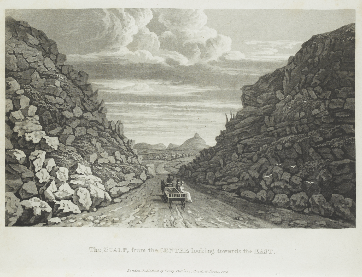 View of The Scalp, a narrow glacial valley to the west of the summit of Barnaslingan Hill, Co. Dublin. A sidecar, or jaunting car, with a driver and two passengers, a man and a woman, is proceeding through the pass in an eastward direction. To either side lies a great jumble of rocks rising high above the roadway. The central perspective extends out to mountains in the background. The tall pointed one represents the Great Sugarloaf, which lies south of the Scalp.