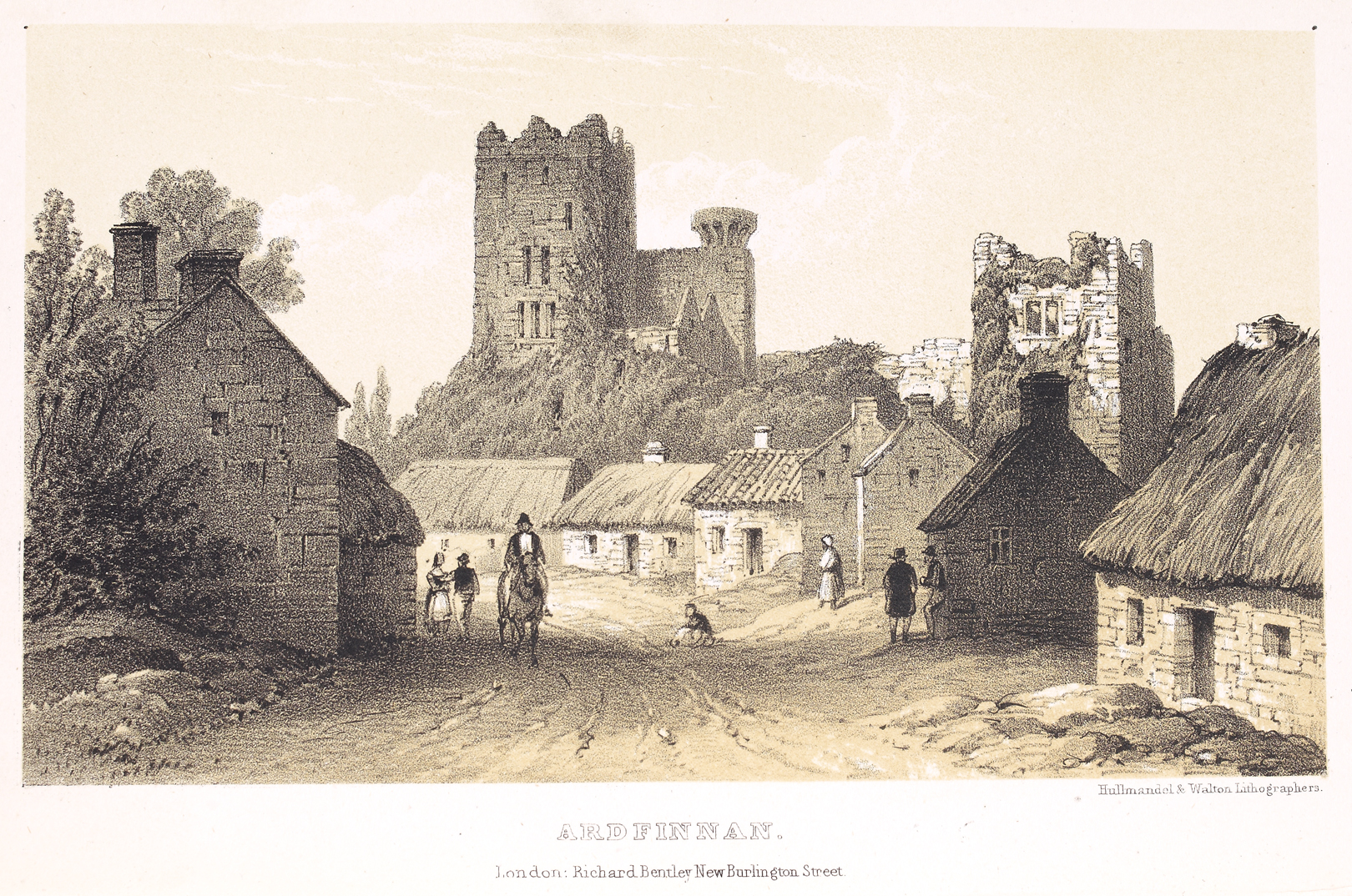 View of Ardfinnan, seen from the north-east. The partially ruined Ardfinnan Castle towers above the village, in the centre of the image. Below the ruin, a road winds between two rows of houses, some thatched, some tiled or slated. A man on horseback rides towards the viewer. Behind him, and to the left, a man and a woman converse. To the right, a child is crouched on the road, possibly playing. On the right-hand side of the road, a woman stands near two men in conversation.