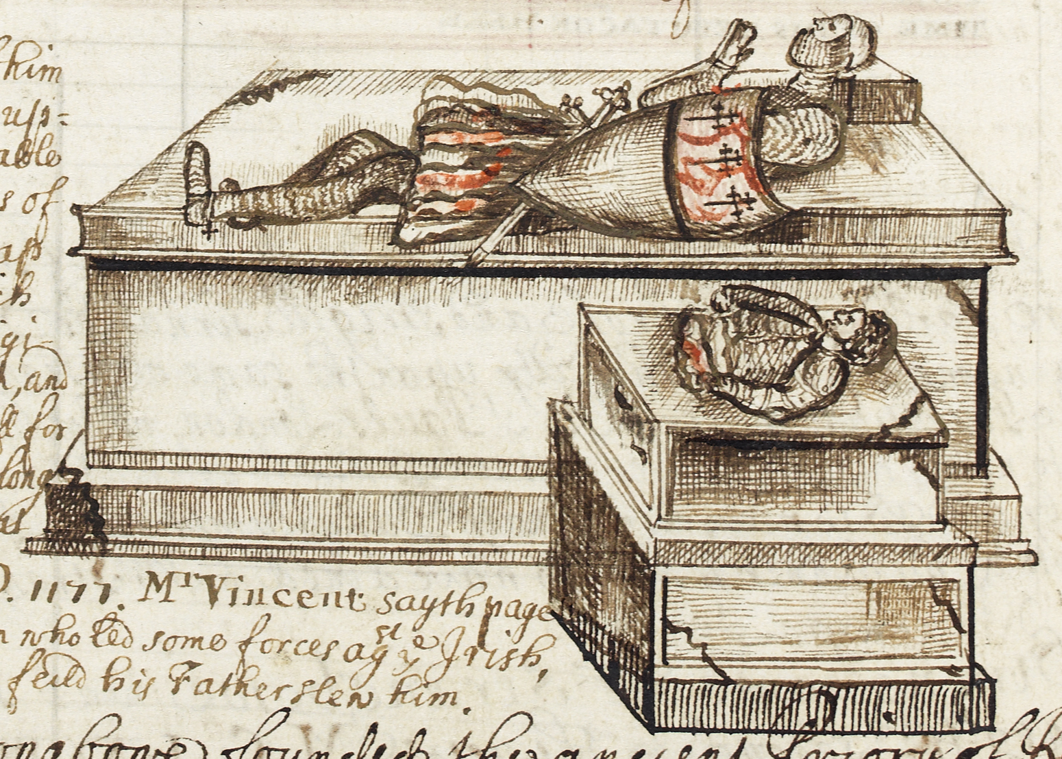 Sepia and red ink sketch of the (supposed) sepulchral monuments of Richard de Clare, Earl of Pembroke, and of his son, in Christ Church Cathedral, Dublin. An effigy rests upon the rectangular tomb, in full armour, with sword and shield, hands joined in prayer. Beside this, upon a second monument, there is a half-length figure, with head and torso only.