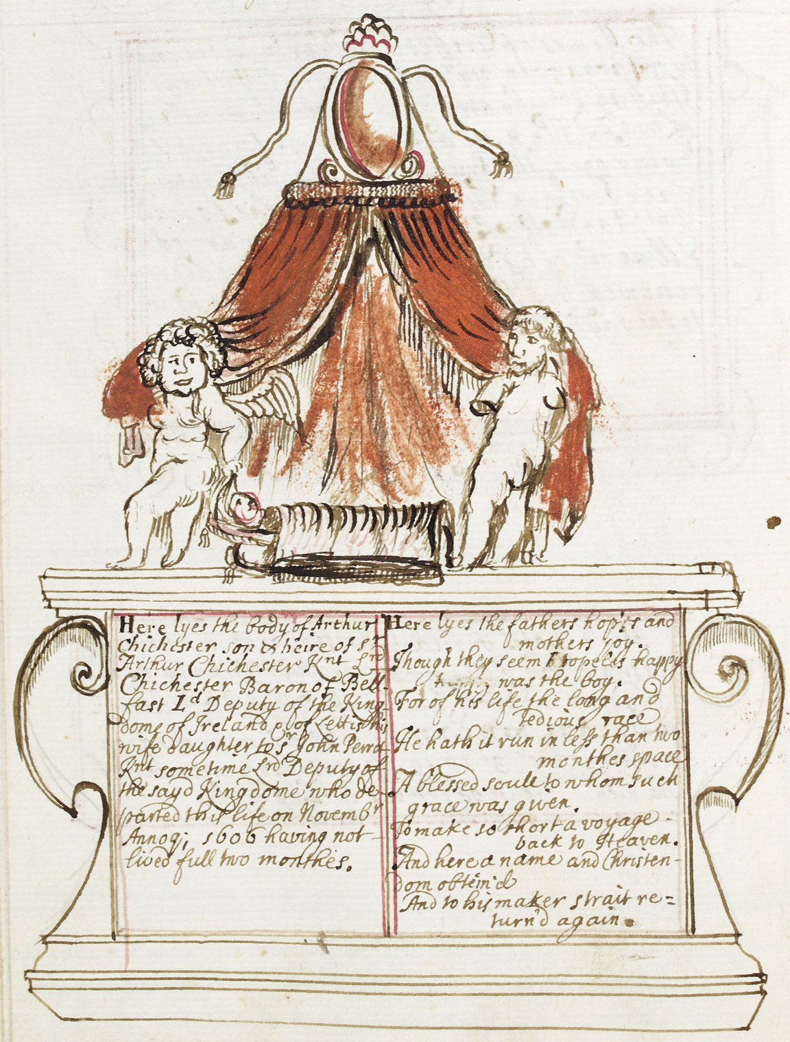 Sepia and red ink wash drawing of sepulchral monument erected for Arthur Chichester, infant son of Sir Arthur Chichester, in Christ Church Cathedral, Dublin. The monument bears a detailed inscription, and is surmounted by the figure of an infant, apparently in swaddling. At his head and feet are two putti holding up a red drape suspended from the centre.